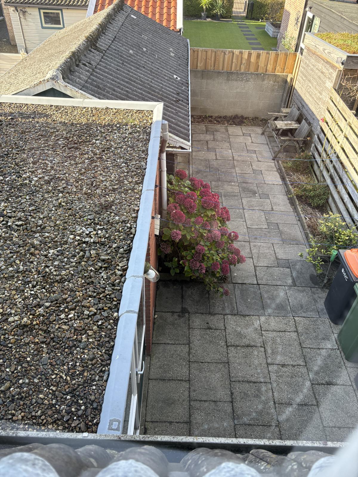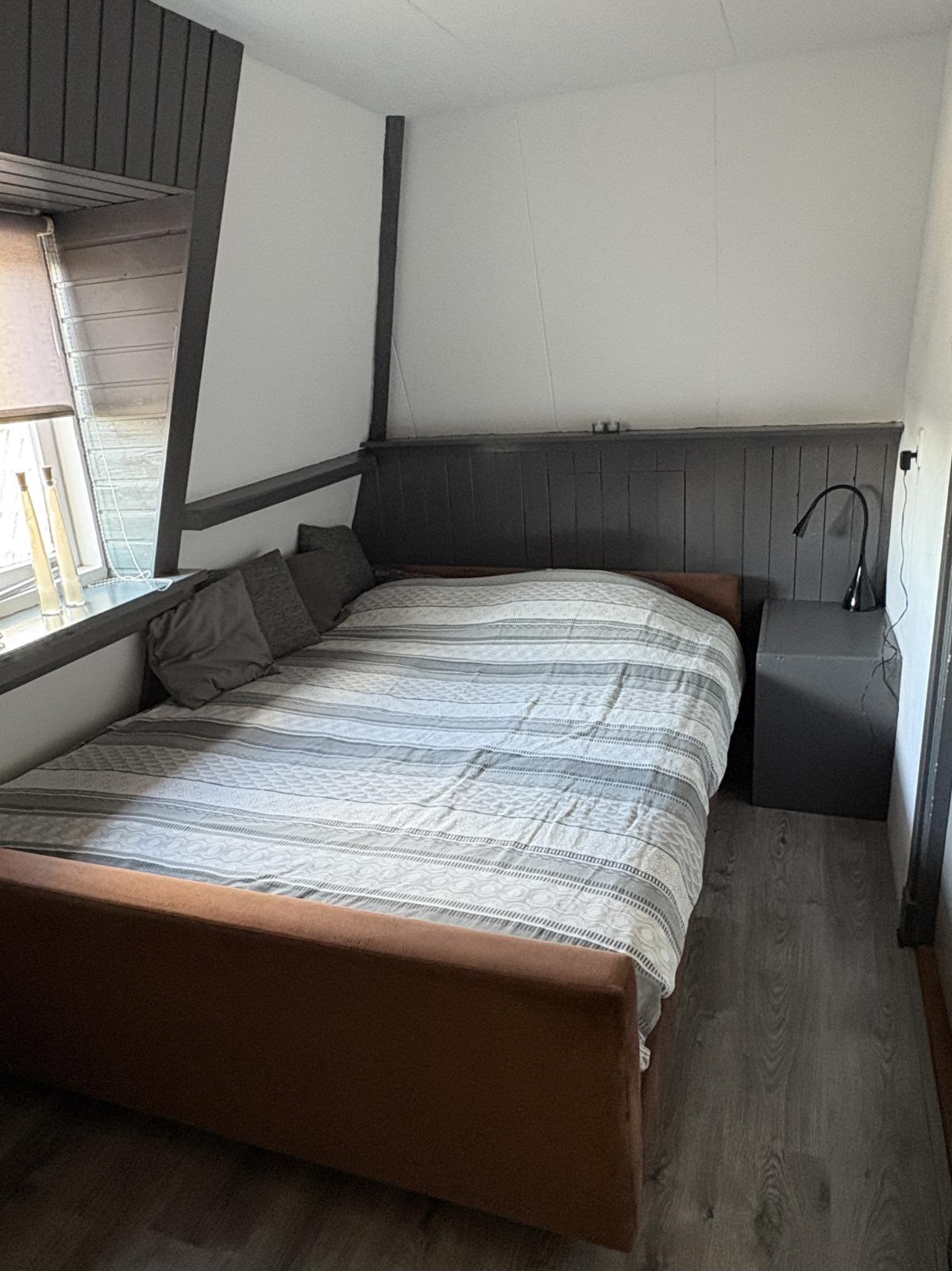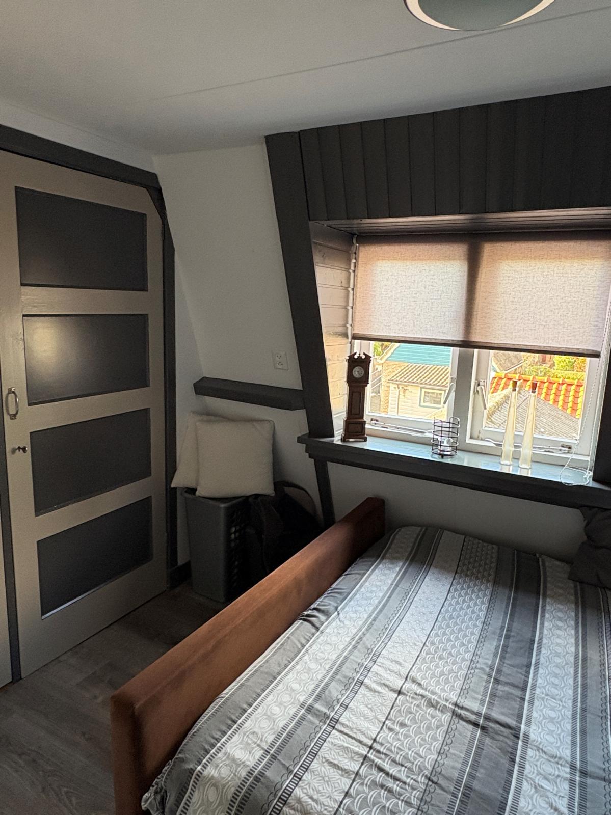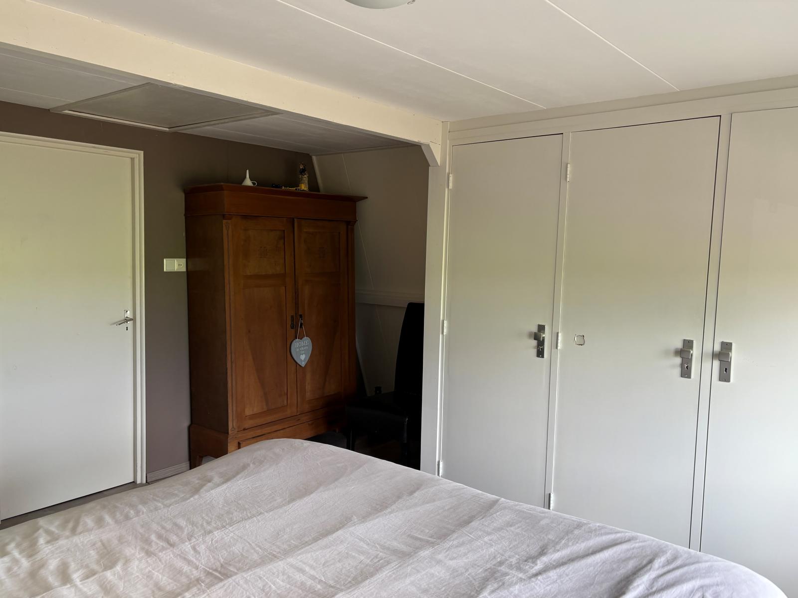 De voorslaapkamer is opvallend ruim en biedt toegang tot de vliering, waar extra bergruimte aanwezig is. De achterslaapkamer heeft uitzicht richting de tuin.