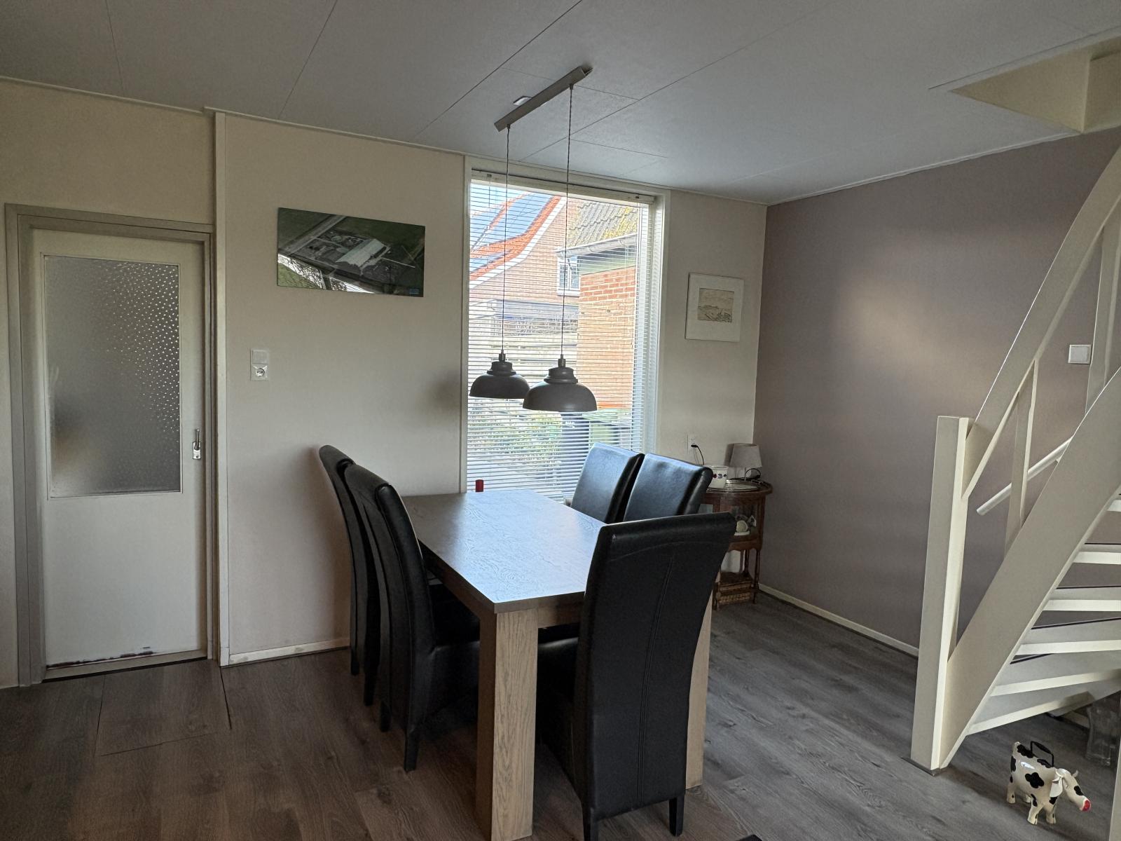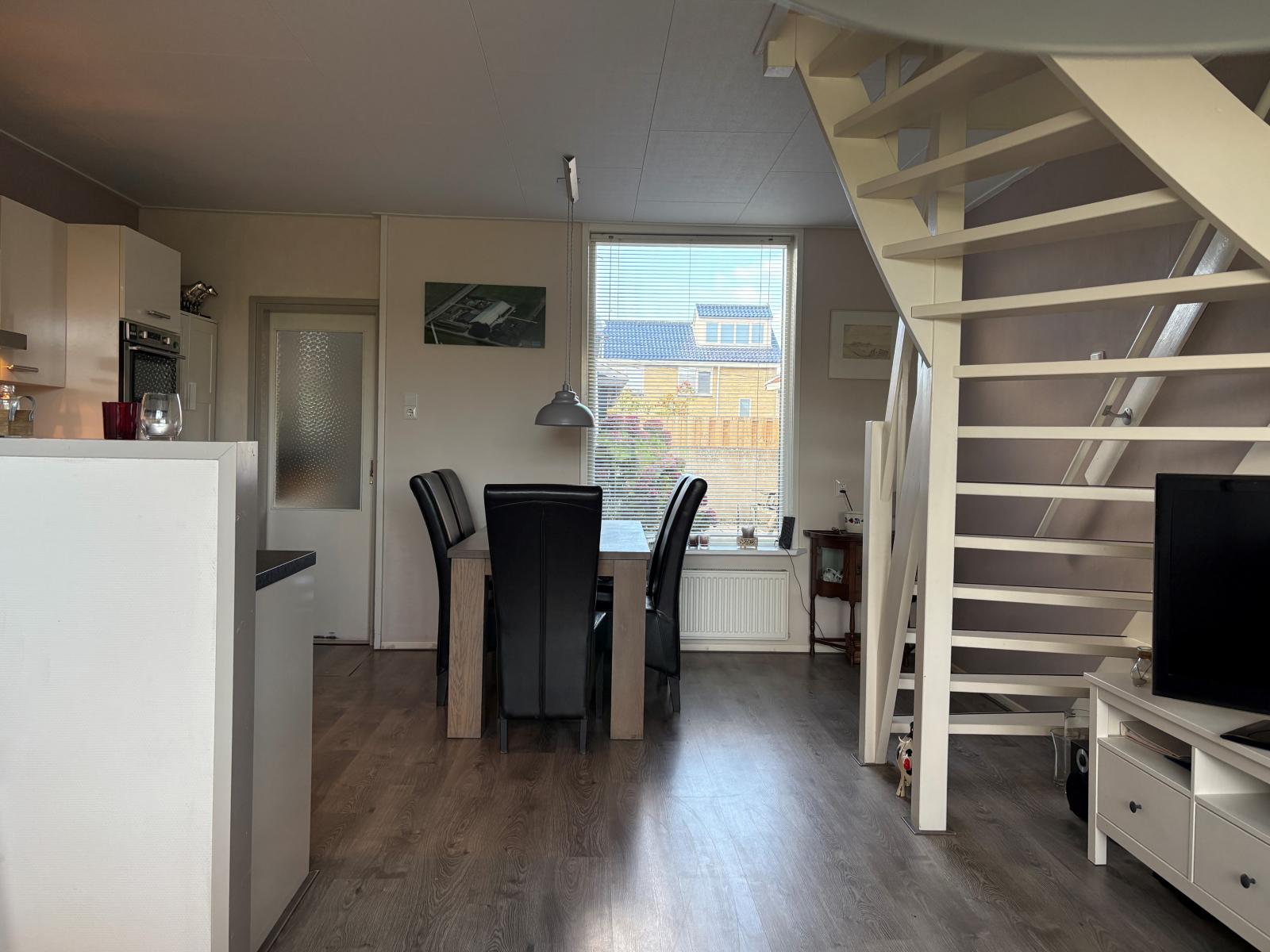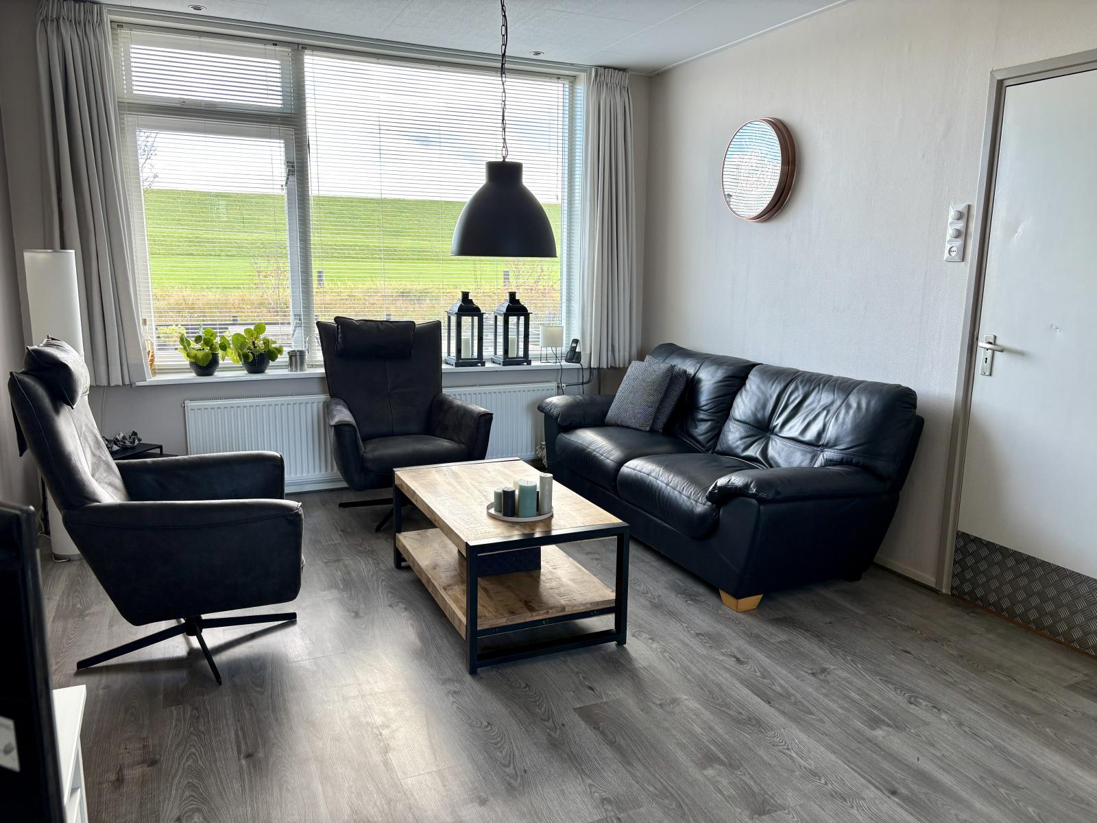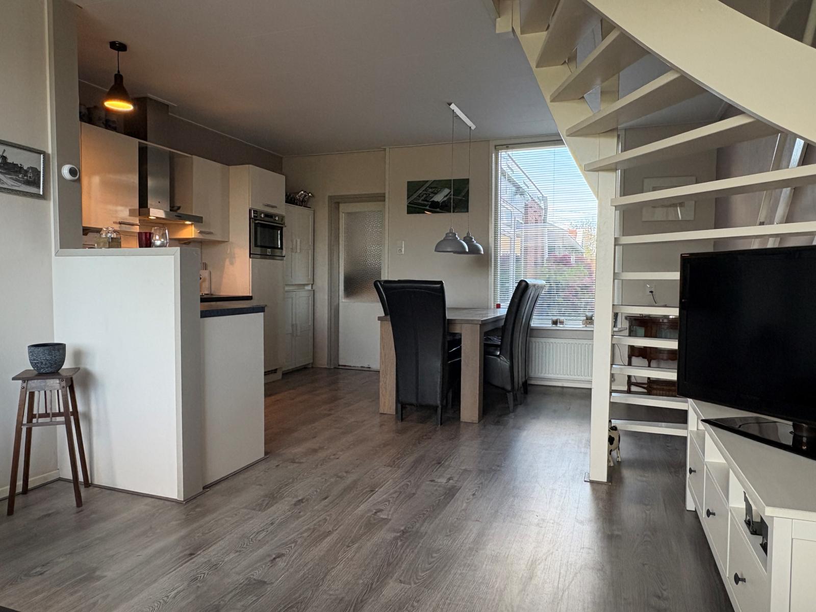 Bij binnenkomst kom je via de hal in de lichte woonkamer met uitzicht op de dijk, waar voldoende ruimte is voor een gezellige zithoek en eettafel. Aan de achterzijde bevindt zich de volledig uitgeruste keuken, voorzien van de nodige inbouwapparatuur en bergruimte.