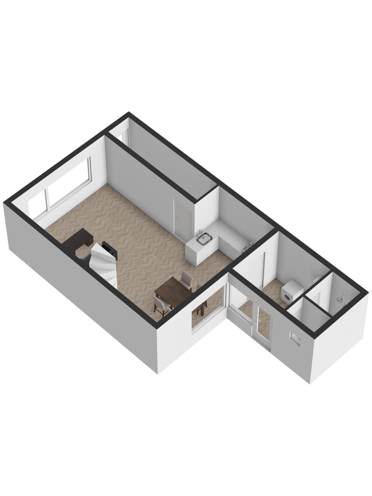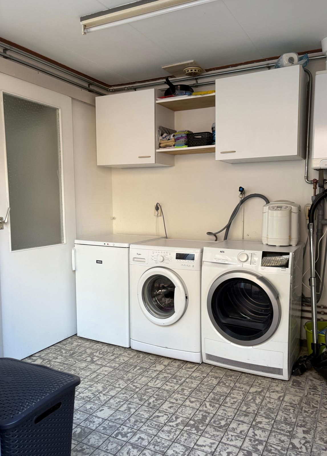 Aangrenzend ligt de bijkeuken met aansluiting voor de wasmachine en toegang tot de badkamer en separaat toilet. Beide ruimtes zijn functioneel maar gedateerd - een mooie kans om deze naar eigen smaak te moderniseren!