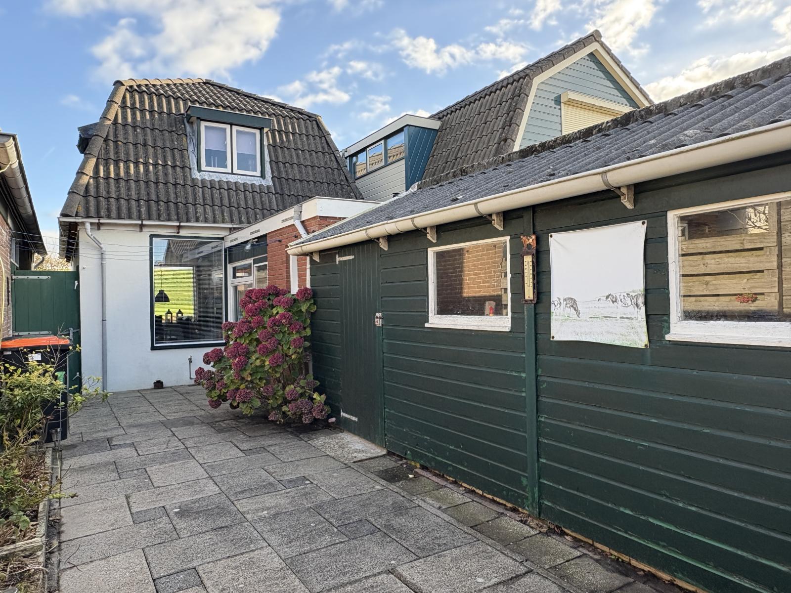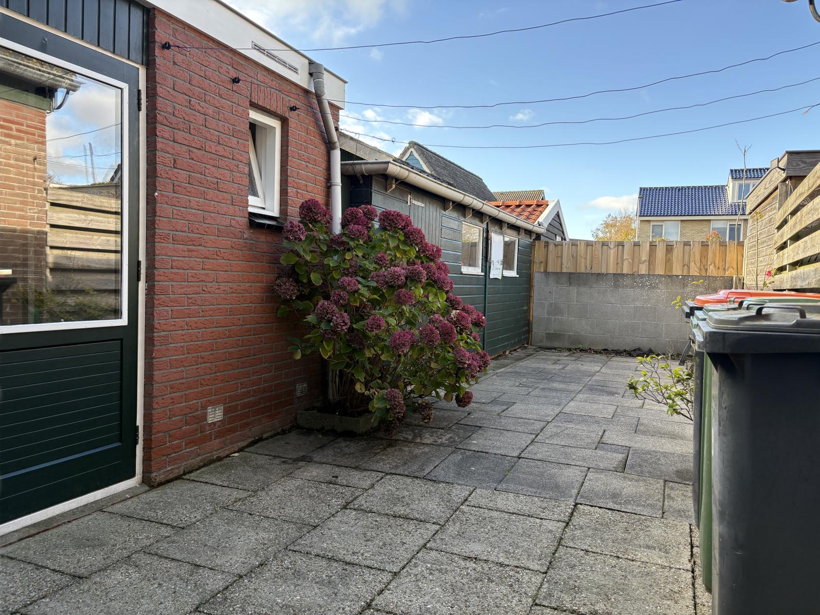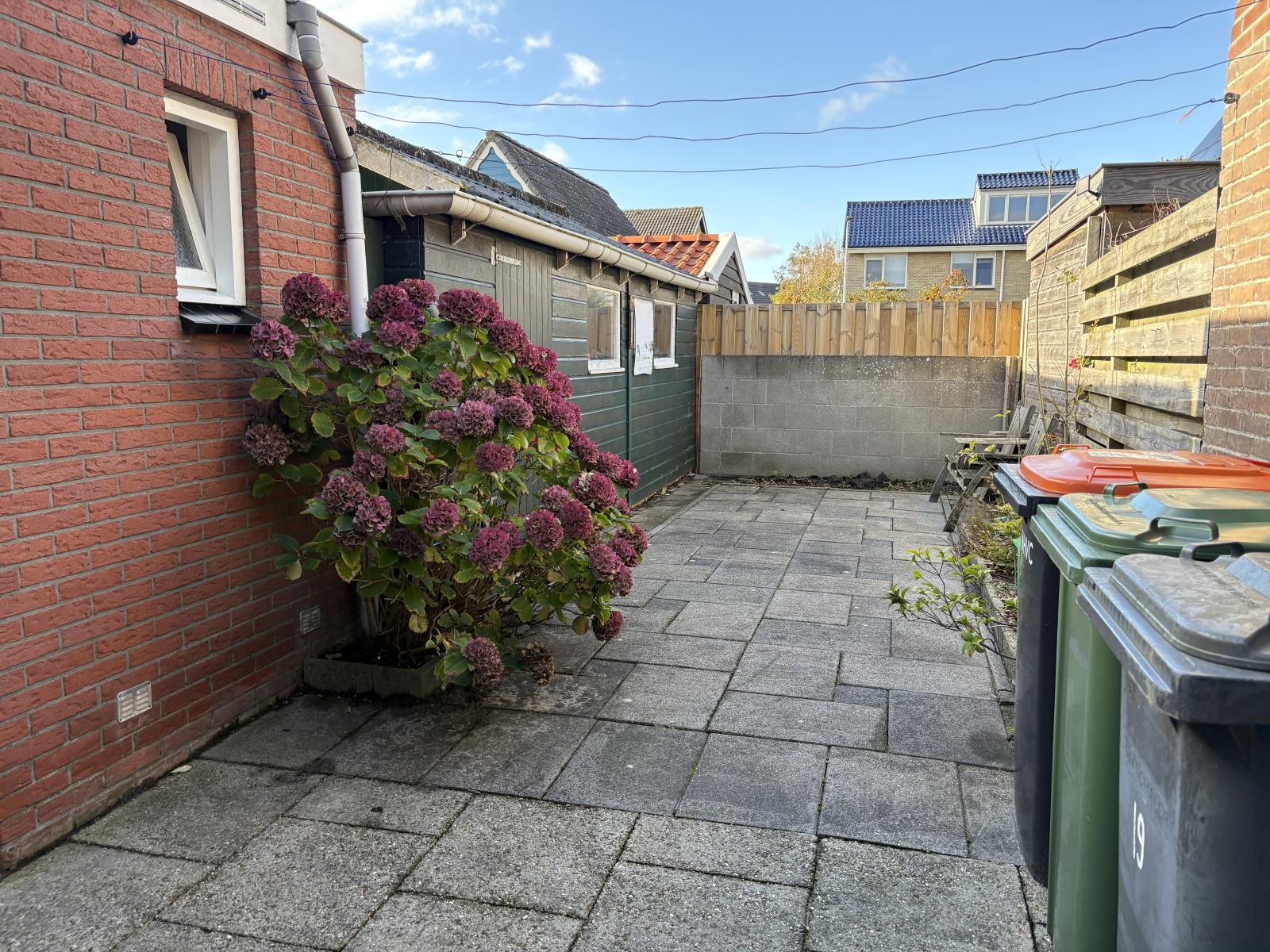 De achtertuin, gelegen op het noordoosten, is bereikbaar via de bijkeuken én via een naastgelegen steeg. Hier vind je een houten schuur, ideaal voor fietsen, tuingereedschap of extra opslag.