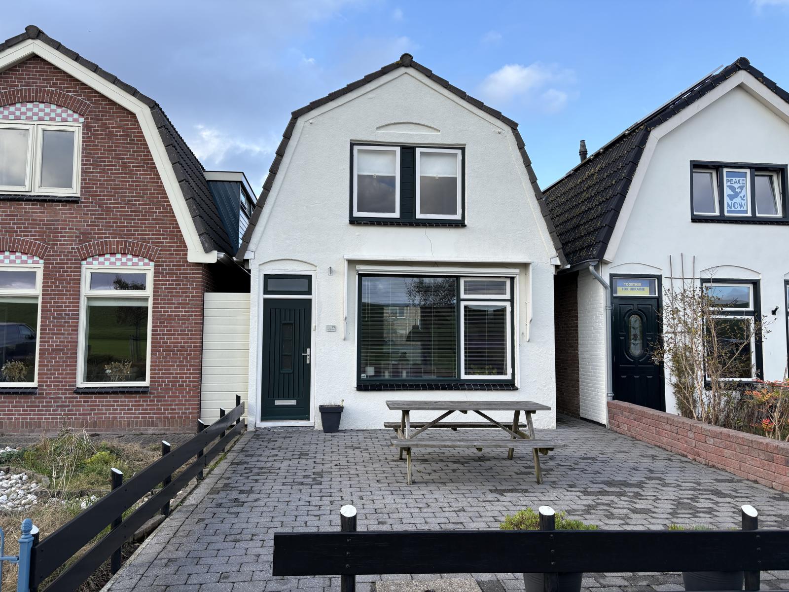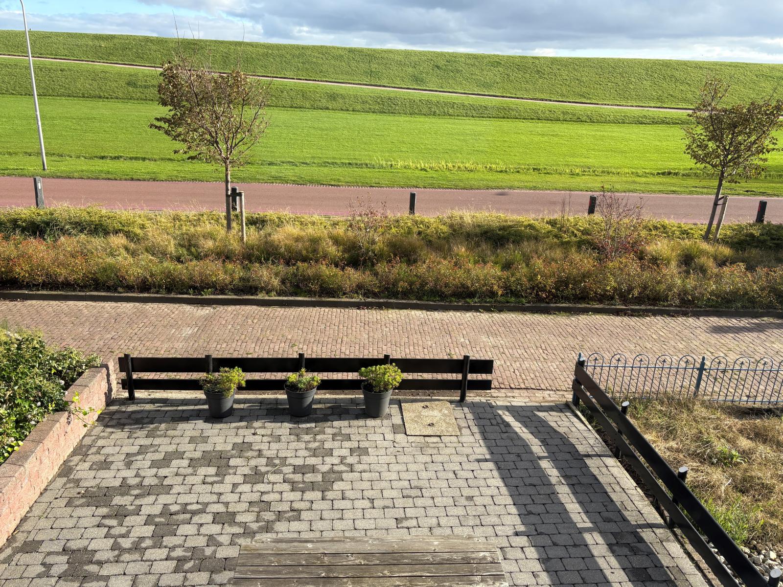 De voortuin is verrassend ruim en biedt, dankzij de gunstige ligging, een fijne plek om in de zon te zitten en te genieten van het vrije uitzicht richting de dijk.
